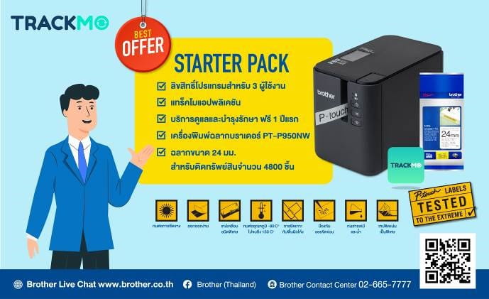 ในช่วงแนะนำ Brother ขอมอบโปรโมชั่นพิเศษ ‘Starter Pack’ ลิขสิทธิ์โปรแกรมสำหรับ 3 ผู้ใช้งาน, TRACKMO แอปพลิเคชัน, บริการดูแลและบำรุงรักษาฟรี 1 ปีแรก, เครื่องพิมพ์ฉลาก Brother รุ่น PT-P950NW พร้อมฉลากขนาด 24 มิลลิเมตร สำหรับติดทรัพย์สินจำนวน 4,800 ชิ้น